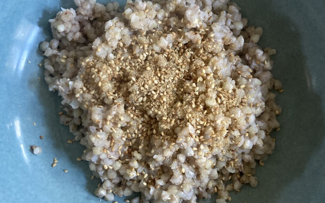 Zunächst hatte ich Bammel. Buchweizen war mir nicht sonderlich lecker in Erinnerung geblieben, als ich ihn mal als Reisersatz ausprobiert hatte. Aber ich hatte mich mit den drei Zutaten: Buchweizen, Sesam und Goamasio eingedeckt und legte los: Ich kochte den Buchweizen, röstete Sesam in der Pfanne und mörserte diesen mit Himalayasalz zu Gomasio. Dazu mischte ich noch geröstete ganze Sesamsamen für den Knack. Und tatsächlich war ich überrascht – es schmeckte gut. Vor allem mit reichlich Gomasio darüber. Ich war mega erleichtert. Dazu trank ich Kräutertee und war guter Dinge, dass zumindest in den nächsten Tagen kein Ekel vor Buchweizen auftauchen würde.